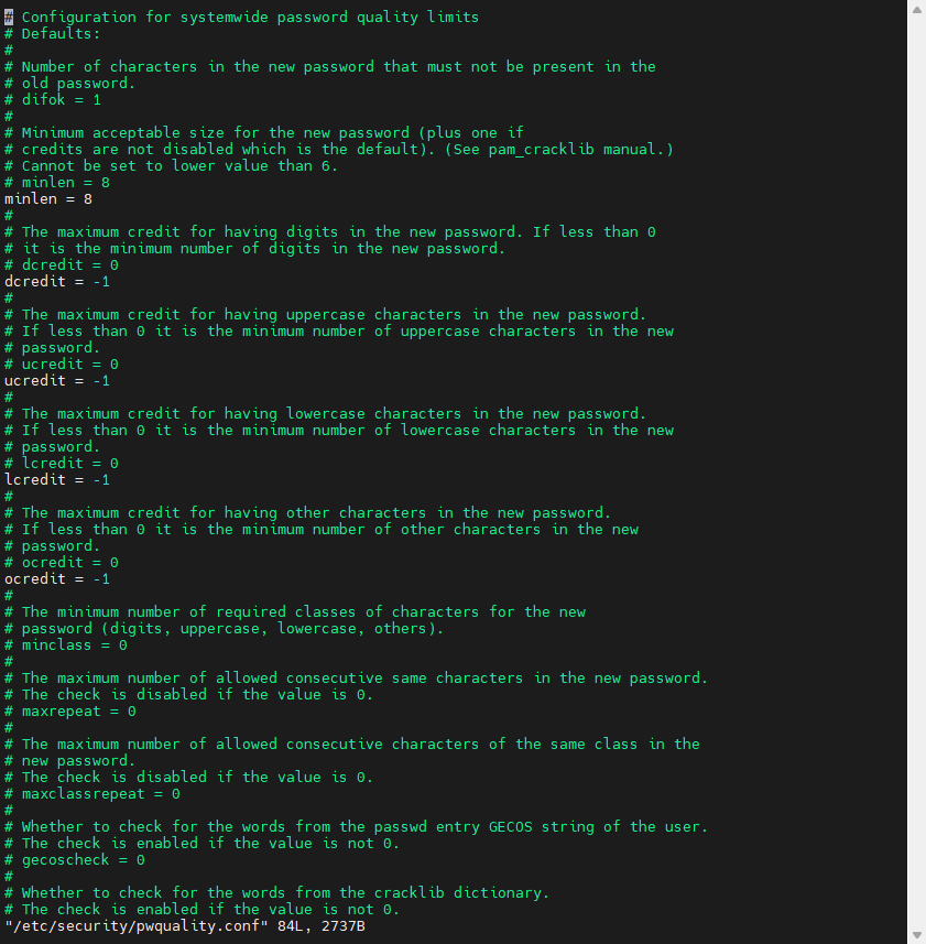 - ucredit: 최소 하나 이상의 대문자 (값: 0 → -1)