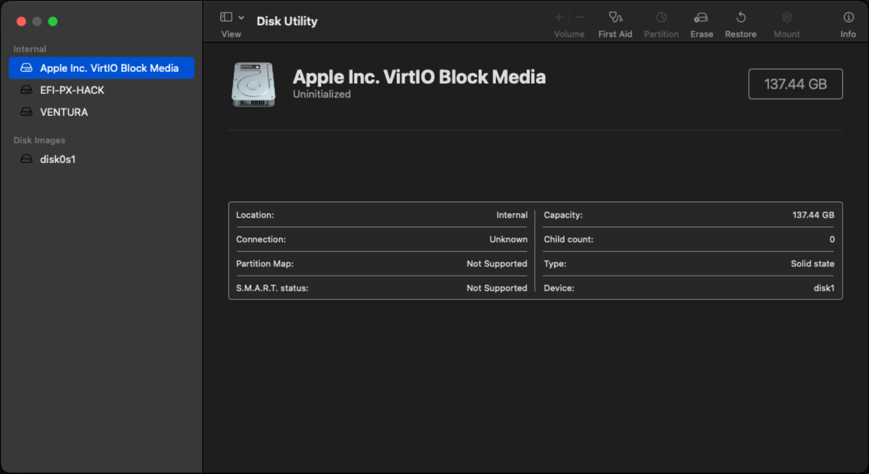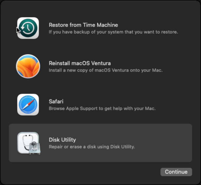 Disk Utility를 선택하여 설치 디스크 초기화를 진행합니다.